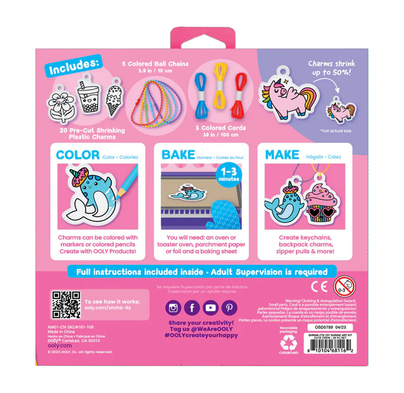 Create adorable charms for your keychain, backpack, or door with the Shrink-Its kit. Just color, bake, and attach to the provided cord or chain. With 20 included charms like a smiling ice cream, kitty donut, and happy bee, the fun never ends!