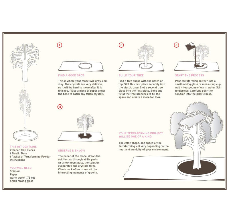 Watch a festival of microcrystals grow and bloom before your eyes. The kit includes a paper tree form, a tray, terraforming solution and instructions.