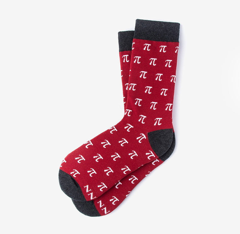Show off your brainy side with these fun Sock Genius socks. These carded cotton socks feature a Pi symbol pattern. Choose from light blue symbols atop a navy blue background or white symbols atop a red background.